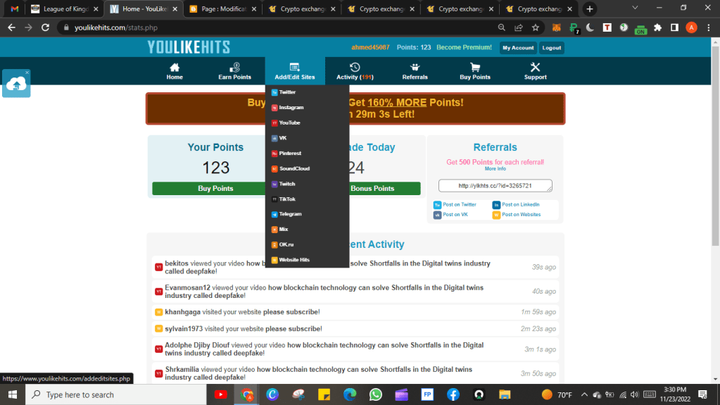 the platform work with a point system which means you earn points from other’s offers then you spend them on your offer or you can just buy points starting from 10 $ and the platform accepts only VISA or MASTERCARD card payment